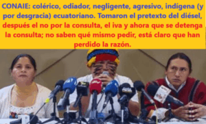 *CONAIE: COLÉRICO, ODIADOR, NEGLIGENTE, AGRESIVO, INDÍGENA (Y POR DESGRACIA) ECUATORIANO. TOMARON EL PRETEXTO DEL DIÉSEL, DESPUÉS EL NO POR LA CONSULTA, EL IVA Y AHORA QUE SE DETENGA LA CONSULTA;